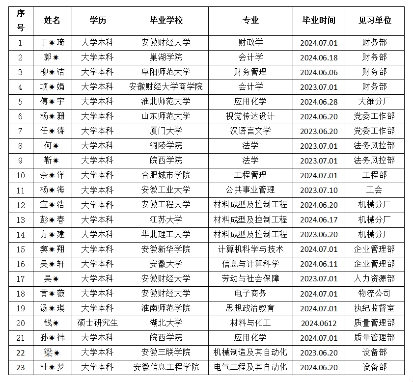 為認(rèn)真落實省國資委、省委宣傳部、省財政廳和人社廳《關(guān)于做好2024年安徽省國有企業(yè)就業(yè)見習(xí)工作的通知》(皖國資考分[2024]70號)精神,皖維集團公開招募大學(xué)生就業(yè)見習(xí),經(jīng)公司相關(guān)單位篩選確定,23名見習(xí)生基本信息對外公示,公示期5天(2024年9月5日至9月9日),接受社會監(jiān)督。監(jiān)督電話:0551-82189867,0551-82189811。